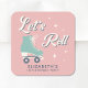 Cute blush pink sticker for her roller skating birthday party featuring "Let's Roll" in a fun 70's style script and a retro-inspired illustration of a teal blue roller skate. Personalize with her name in simple dark teal blue typography.