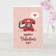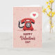 This greeting card shows a classic rotary telephone in deep ruby red sitting in the center of a blush pink background. The phone has a black coiled cord and a round dial with small white number areas, and it feels like it’s waiting for a sweet call. Above the handset, there’s a speech bubble with a bright fuchsia heart inside, like a little “I love you” floating in the air ❤️. The background is sprinkled with tiny white and light pink x marks like kisses, plus a few simple outline hearts for extra warmth. Near the bottom, the text reads “Happy Valentine’s Day,” with “Happy” and “DAY” in clear dark lettering and “Valentine’s” in flowing deep red cursive across the middle. A faint shadow under the phone adds a bit of depth while keeping the look simple and flat. It’s a meaningful card to give because it nods to staying connected and taking a moment to reach out, whether it’s for romance or close friendship 🥰. Hope it helps you share your Valentine’s Day sentiments with someone you care about.
