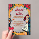 This elegant comic book-style wedding acrylic invitation is perfect for a modern wedding. The retro design features a vintage bride and groom illustration and black calligraphy on a comic book-themed background.