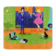 This Retro Romantic Evening Couple Cutting Board looks like a scene out of a 1960's romantic comedy. The minimalist design features an attractive cartoon couple in the living room of a mid century modern, urban apartment. The room prominently features a green, stone wall with a floor to ceiling window with a view. Through the window, we can see the blue silhouette of a big city skyline. A crescent moon is just visible in the orange sky of sunset. The furnishings in the room include a green, lounge chair with matching footstool, a yellow, sputnik light fixture, and a turquoise, cone shaped fireplace, complete with roaring fire. In the center of the orange flooring, there is a round, green shag rug. A portable, turquoise and black record player is placed on the rug. Next to the record player, a vinyl record can be seen poking out of a kitschy album cover. Also on the rug, there is a sleek, black cat wearing a teal collar. This fancy feline is sitting in front of a martini glass. Enjoying this scene, we have a very sophisticated couple. There is a suave man wearing a blue suit, light blue shirt and red tie. The tall, dark and handsome man is enjoying the company of an elegant blonde woman. The lovely lady is wearing a hot pink dress with a form fitting bodice and flared skirt. They are each holding a crystal martini glass with a floating olive. Cheers! Here's to the perfect evening at home!
