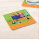 This Retro Romantic Evening Couple Paper Coaster looks like a scene out of a 1960's romantic comedy. The minimalist design features an attractive cartoon couple in the living room of a mid century modern, urban apartment. The room prominently features a green, stone wall with a floor to ceiling window with a view. Through the window, we can see the blue silhouette of a big city skyline. A crescent moon is just visible in the orange sky of sunset. The furnishings in the room include a green, lounge chair with matching footstool, a yellow, sputnik light fixture, and a turquoise, cone shaped fireplace, complete with roaring fire. In the center of the orange flooring, there is a round, green shag rug. A portable, turquoise and black record player is placed on the rug. Next to the record player, a vinyl record can be seen poking out of a kitschy album cover. Also on the rug, there is a sleek, black cat wearing a teal collar. This fancy feline is sitting in front of a martini glass. Enjoying this scene, we have a very sophisticated couple. There is a suave man wearing a blue suit, light blue shirt and red tie. The tall, dark and handsome man is enjoying the company of an elegant blonde woman. The lovely lady is wearing a hot pink dress with a form fitting bodice and flared skirt. They are each holding a crystal martini glass with a floating olive. Cheers! Here's to the perfect evening at home!