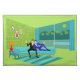 This Retro Romantic Gay Couple Cloth Placemat design is simply fabulous! The 1960s style, minimalist art design features an attractive couple enjoying a romantic evening. They are snuggled up on their beautiful, modern turquoise sectional, in their Palm Springs home. The sophisticated, lime green room prominently features a sloped green stone wall, on which kitschy, vintage pebble art is hanging. A fun orange lamp with a two-tier fiberglass shade adorns a side table. The well-dressed men are holding martinis. Through the sliding glass doors, a full moon lights up the night, making mountains, palm trees, and a swimming pool visible. Cheers to the perfect evening!