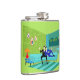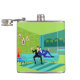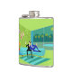 This Retro Romantic Gay Couple Flask design is simply fabulous! The 1960s style, minimalist art design features an attractive couple enjoying a romantic evening. They are snuggled up on their beautiful, modern turquoise sectional, in their Palm Springs home. The sophisticated, lime green room prominently features a sloped green stone wall, on which kitschy, vintage pebble art is hanging. A fun orange lamp with a two-tier fiberglass shade adorns a side table. The well-dressed men are holding martinis. Through the sliding glass doors, a full moon lights up the night, making mountains, palm trees, and a swimming pool visible. Cheers to the perfect evening!