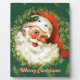 The Retro Santa Decorative Plague will add a touch of holiday spirit to any room. Also makes a great gift! The design features Santa's smiling face surrounded by a wreath, on a dark green background. The text reads, "Merry Christmas." Customize the text as desired.
