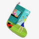 Welcome to Suburbia! This Retro Saturday Morning Christmas Stocking features an attractive minimalist cartoon couple in their little corner of paradise. From the window of a turquoise and teal brick house, we can see Mrs. Homemaker. The beautiful redhead is wearing a hot pink frock. She is holding a pitcher of freshly squeezed lemonade in one hand. On the windowsill in front of her, there is a piping hot, homemade, lattice topped, fruit pie in a green pie plate. Mr. Man of the House is standing on the lush green lawn. He is wearing a blue shorts and a yellow shirt that matches his wife's sunny disposition. He is standing behind a red lawnmower. We can see that he has already mowed a strip of grass, but, at this point, it's difficult to tell if he is working hard or hardly working. The mowing seems to be at a standstill while he enjoys a tangy glass of lemonade. Ah, refreshing! The yellow sun is peeking from behind fluffy, light blue clouds. The sky is the shade of aqua reserved for Hometown, USA in kitschy, mid century modern artwork. The opposite side of the stocking features a teal and turquoise brick pattern.
