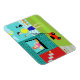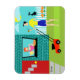Welcome to Suburbia! This Retro Saturday Morning Flexi Magnet features an attractive minimalist cartoon couple in their little corner of paradise. From the window of a turquoise and teal brick house, we can see Mrs. Homemaker. The beautiful redhead is wearing a hot pink frock. She is holding a pitcher of freshly squeezed lemonade in one hand. On the windowsill in front of her, there is a piping hot, homemade, lattice topped, fruit pie in a green pie plate. On the walkway, in front of the red door to the home, the rolled up Saturday morning newspaper is waiting to be read. Mr. Man of the House is standing on the lush green lawn. He is wearing a blue shorts and a yellow shirt that matches his wife's sunny disposition. He is standing behind a red lawnmower. We can see that he has already mowed a strip of grass, but, at this point, it's difficult to tell if he is working hard or hardly working. The mowing seems to be at a standstill while he enjoys a tangy glass of lemonade. Ah, refreshing! Beside the house, the family feline is perched on a white picket fence. Snowball, the ironically named black cat, is looking down on her loyal subjects and the orange and yellow flowers that border the fence row. The yellow sun is peeking from behind fluffy, light blue clouds. The sky is the shade of aqua reserved for Hometown, USA in kitschy, mid century modern artwork.