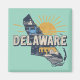 Fun fridge magnet features a retro style scenic graphic of Delaware's state silhouette on aqua background.