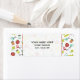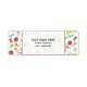 An address label featuring a sewing themed design consisting of a sewing machine, spools of thread, a pin cushion, scissors, fabric swatches, and sewing needles. Design has a retro red, yellow, orange, blue, and turquoise color scheme.