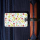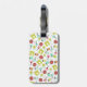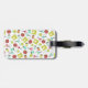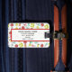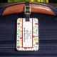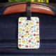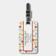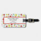 A luggage tag featuring a sewing themed design featuring illustrations of sewing machines, pin cushions, sewing needles, spools of thread, scissors, and fabric swatches. Personalize the text on front inside sheer area outlined in red.