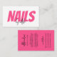 This retro and simple business card is perfect for any professional. It features contemporary and artsy black cursive font and neon pink blocky font on top of a minimalist white background; the perfect design to attract potential customers. It's a great choice for nail artists.