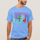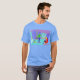 Brrr... This Retro Ski Vacation Night T-Shirt will have you looking around for a Saint Bernard with a cask of brandy. The mid century modern cartoon drawing features a glamorous couple cooped up in a colorful ski chalet with a magnificent view. The room has a turquoise floor and purple walls. Hey, it's the 60s! Floor to ceiling windows reveal snow covered mountains, a turquoise sky with light blue clouds, and the silhouettes of happy people whizzing by in ski lift gondolas. Inside the room, we see an olive green, cone fireplace with a glowing fire. Tossed on the floor are two yellow skis next to ski poles. In the center of the room, a handsome man with black hair is wearing blue pants and a green turtleneck sweater. He is carrying a tray of martinis. One arm is outreached, offering a martini to a blonde woman's waiting hand. The woman, is sitting in a red, egg chair. She is wearing navy blue pants and a hot pink sweater. Please excuse her for not getting up, but she has a cast on one leg!