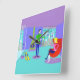 Brrr... This Retro Ski Vacation Wall Clock will have you looking around for a Saint Bernard with a cask of brandy. The mid century modern cartoon drawing features a glamorous couple cooped up in a colorful ski chalet with a magnificent view. The room has a turquoise floor and purple walls. Hey, it's the 60s! Floor to ceiling windows reveal snow covered mountains, a turquoise sky with light blue clouds, and the silhouettes of happy people whizzing by in ski lift gondolas. Inside the room, we see an olive green, cone fireplace with a glowing fire. Tossed on the floor are two yellow skis next to ski poles. In the center of the room, a handsome man with black hair is wearing blue pants and a green turtleneck sweater. He is carrying a tray of martinis. One arm is outreached, offering a martini to a blonde woman's waiting hand. The woman, is sitting in a red, egg chair. She is wearing navy blue pants and a hot pink sweater. Please excuse her for not getting up, but she has a cast on one leg!