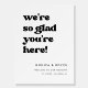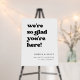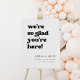 We're so glad you're here wedding welcome sign. A retro chic theme: adopt this slightly vintage and stylish typographic design for your wedding stationery, with a classic black and white theme. Customizable text colors and backgrounds.