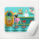 Serve up something special with this Retro Soda Fountain Mousepad. The minimalist art, cartoon drawing design features the interior of the coolest spot in town. It's a 1950's soda fountain, in all of its kitschy glory! Against the backdrop of an aqua wall, we can see posters advertising the specialties of the house. One poster shows a hamburger and bottle of pop for the bargain price of 15 cents. The other poster shows two scoops of ice cream in a sugar cone for a mere 5 cents. With prices like these, it must be difficult to watch your waistline! A most competent soda jerk is manning the teal counter with yellow accents. The young man with the strong work ethic is holding an ice cream cone with a single scoop of lemon yellow ice cream--although, to be fair, it could be pineapple! The clean-cut lad is wearing a pristine, white shirt with a black, bow tie and a white hat with red accents. On the opposite side of the counter, we see three red and chrome bar stools. Perched on one of the stools is a blonde teenybopper whose mouth is surely watering. It's unclear if her mouth is watering over the ice cream cone that is headed her way or the industrious young man who is serving it. She is wearing a pink poodle skirt and a form fitting black top. Her yellow locks are pulled back in a classic ponytail. Next to this cutie of a customer there is a colorful, classic jukebox, which features brown, wood grain, paneling and colorful neon lights. Better than that, it is sure to feature all of the greatest rock and roll hits of the time! The floor of this mid century modern ice cream parlor is an aqua and teal, checkerboard pattern that is just screaming for someone to try all of the latest dance moves.