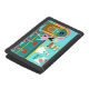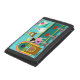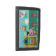 Serve up something special with this Retro Soda Fountain Nylon Wallet. The minimalist art, cartoon drawing design features the interior of the coolest spot in town. It's a 1950's soda fountain, in all of its kitschy glory! Against the backdrop of an aqua wall, we can see posters advertising the specialties of the house. One poster shows a hamburger and bottle of pop for the bargain price of 15 cents. The other poster shows two scoops of ice cream in a sugar cone for a mere 5 cents. With prices like these, it must be difficult to watch your waistline! A most competent soda jerk is manning the teal counter with yellow accents. The young man with the strong work ethic is holding an ice cream cone with a single scoop of lemon yellow ice cream--although, to be fair, it could be pineapple! The clean-cut lad is wearing a pristine, white shirt with a black, bow tie and a white hat with red accents. On the opposite side of the counter, we see three red and chrome bar stools. Perched on one of the stools is a blonde teenybopper whose mouth is surely watering. It's unclear if her mouth is watering over the ice cream cone that is headed her way or the industrious young man who is serving it. She is wearing a pink poodle skirt and a form fitting black top. Her yellow locks are pulled back in a classic ponytail. Next to this cutie of a customer there is a colorful, classic jukebox, which features brown, wood grain, paneling and colorful neon lights. Better than that, it is sure to feature all of the greatest rock and roll hits of the time! The floor of this mid century modern ice cream parlor is an aqua and teal, checkerboard pattern that is just screaming for someone to try all of the latest dance moves.