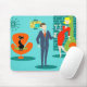Honey, I'm home! This Retro Space Age Cartoon Couple Mousepad will have you feeling envious of the cartoon couple on a mousepad! The design features a turquoise background with teal bricks and an olive green, cone fireplace. A sleek, black cat is sitting on a sleek orange chair. There is a teal, starburst wall clock and a two-tier pendant lamp in shades of yellow, blue and black. Front and center, there is a distinguished, martini-swilling businessman in a blue suit and orange tie. To his side, his blonde bombshell of a trophy wife is wearing a red wiggle dress and holding a tray of martinis. Va-va-va-voom!