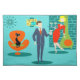 Honey, I'm home! This Retro Space Age Cartoon Couple Placemat will have you feeling envious of the cartoon couple on a placemat! The design features a turquoise background with teal bricks and an olive green, cone fireplace. A sleek, black cat is sitting on a sleek orange chair. There is a teal, starburst wall clock and a two-tier pendant lamp in shades of yellow, blue and black. Front and center, there is a distinguished, martini-swilling businessman in a blue suit and orange tie. To his side, his blonde bombshell of a trophy wife is wearing a red wiggle dress and holding a tray of martinis. Va-va-va-voom!