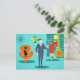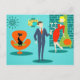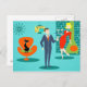 Honey, I'm home! This Retro Space Age Cartoon Couple Postcard will have you feeling envious of the cartoon couple on a greeting card! The design features a turquoise background with teal bricks and an olive green, cone fireplace. A sleek, black cat is sitting on a sleek orange chair. There is a teal, starburst wall clock and a two-tier pendant lamp in shades of yellow, blue and black. Front and center, there is a distinguished, martini-swilling businessman in a blue suit and orange tie. To his side, his blonde bombshell of a trophy wife is wearing a red wiggle dress and holding a tray of martinis. Va-va-va-voom!