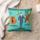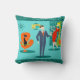 Honey, I'm home! This Retro Space Age Cartoon Couple Throw Pillow will have you feeling envious of the cartoon couple on a throw pillow! The design features a turquoise background with teal bricks and an olive green, cone fireplace. A sleek, black cat is sitting on a sleek orange chair. There is a teal, starburst wall clock and a two-tier pendant lamp in shades of yellow, blue and black. Front and center, there is a distinguished, martini-swilling businessman in a blue suit and orange tie. To his side, his blonde bombshell of a trophy wife is wearing a red wiggle dress and holding a tray of martinis. The opposite side features a design of teal and turquoise bricks. Va-va-va-voom!