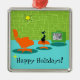 It is said that dogs have owners and cats have staff. The feline on this Customizable Retro Space Age Kitty Christmas Ornament couldn't agree more! The 1960's style, minimalist art design features a sleek, black cat in a mid century modern living room. The sophisticated room prominently features a green, stone wall. The carpet is aqua with teal shadows. The furnishings of the room include a yellow, sputnik light figure, an orange lounge chair with matching footstool and a green television with rabbit ears. The lucky black cat can be seen perched on the footstool in front of the television. Its favorite show is on! On the television screen, we can see a black and white, classic television family solving all of life's problems in a half hour show. Personalize this for a one of a kind gift. This design is purrrfect, if we do say so ourselves.