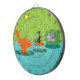 It is said that dogs have owners and cats have staff. The feline on this Retro Space Age Kitty Dart Board couldn't agree more! The 1960's style, minimalist art design features a sleek, black cat in a mid century modern living room. The sophisticated room prominently features a green, stone wall. The carpet is aqua with teal shadows. The furnishings of the room include a yellow, sputnik light figure, an orange lounge chair with matching footstool and a green television with rabbit ears. The lucky black cat can be seen perched on the footstool in front of the television. Its favorite show is on! On the television screen, we can see a black and white, classic television family solving all of life's problems in a half hour show. This design is purrrfect, if we do say so ourselves.