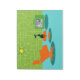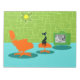 It is said that dogs have owners and cats have staff. The feline on this Retro Space Age Kitty Notepad couldn't agree more! The 1960's style, minimalist art design features a sleek, black cat in a mid century modern living room. The sophisticated room prominently features a green, stone wall. The carpet is aqua with teal shadows. The furnishings of the room include a yellow, sputnik light figure, an orange lounge chair with matching footstool and a green television with rabbit ears. The lucky black cat can be seen perched on the footstool in front of the television. Its favorite show is on! On the television screen, we can see a black and white, classic television family solving all of life's problems in a half hour show. This design is purrrfect, if we do say so ourselves.