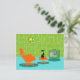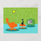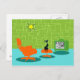 It is said that dogs have owners and cats have staff. The feline on this Retro Space Age Kitty Postcard couldn't agree more! The 1960's style, minimalist art design features a sleek, black cat in a mid century modern living room. The sophisticated room prominently features a green, stone wall. The carpet is aqua with teal shadows. The furnishings of the room include a yellow, sputnik light figure, an orange lounge chair with matching footstool and a green television with rabbit ears. The lucky black cat can be seen perched on the footstool in front of the television. Its favorite show is on! On the television screen, we can see a black and white, classic television family solving all of life's problems in a half hour show. This design is purrrfect, if we do say so ourselves.