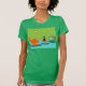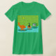 It is said that dogs have owners and cats have staff. The feline on this Retro Space Age Kitty T-Shirt couldn't agree more! The 1960's style, minimalist art design features a sleek, black cat in a mid century modern living room. The sophisticated room prominently features a green, stone wall. The carpet is aqua with teal shadows. The furnishings of the room include a yellow, sputnik light figure, an orange lounge chair with matching footstool and a green television with rabbit ears. The lucky black cat can be seen perched on the footstool in front of the television. Its favorite show is on! On the television screen, we can see a black and white, classic television family solving all of life's problems in a half hour show. This design is purrrfect, if we do say so ourselves.