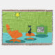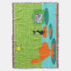 It is said that dogs have owners and cats have staff. The feline on this Retro Space Age Kitty Throw Blanket couldn't agree more! The 1960's style, minimalist art design features a sleek, black cat in a mid century modern living room. The sophisticated room prominently features a green, stone wall. The carpet is aqua with teal shadows. The furnishings of the room include a yellow, sputnik light figure, an orange lounge chair with matching footstool and a green television with rabbit ears. The lucky black cat can be seen perched on the footstool in front of the television. Its favorite show is on! On the television screen, we can see a black and white, classic television family solving all of life's problems in a half hour show. This design is purrrfect, if we do say so ourselves.