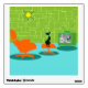 It is said that dogs have owners and cats have staff. The feline on this Retro Space Age Kitty Wall Decal couldn't agree more! The 1960's style, minimalist art design features a sleek, black cat in a mid century modern living room. The sophisticated room prominently features a green, stone wall. The carpet is aqua with teal shadows. The furnishings of the room include a yellow, sputnik light figure, an orange lounge chair with matching footstool and a green television with rabbit ears. The lucky black cat can be seen perched on the footstool in front of the television. Its favorite show is on! On the television screen, we can see a black and white, classic television family solving all of life's problems in a half hour show. This design is purrrfect, if we do say so ourselves.
