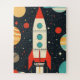 A vibrant retro-themed illustration of a classic rocket ship blasting off into space, surrounded by colorful planets, stars, and cosmic elements. the design uses bold reds, teals, and oranges against a dark starry background, evoking mid-century sci-fi aesthetics. This whimsical and nostalgic artwork is ideal for children. The best part of this oversized puzzle is that you can customize it with your kid's name.