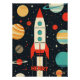 A vibrant retro-themed illustration of a classic rocket ship blasting off into space, surrounded by colorful planets, stars, and cosmic elements. the design uses bold reds, teals, and oranges against a dark starry background, evoking mid-century sci-fi aesthetics. This whimsical and nostalgic artwork is ideal for children’s rooms. The best part of this poster is that you can customize it with your kid's name.