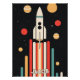 A vibrant retro-themed illustration of a classic rocket ship blasting off into space, surrounded by colorful planets, stars, and cosmic elements. the design uses bold reds, teals, and oranges against a dark starry background, evoking mid-century sci-fi aesthetics. This whimsical and nostalgic artwork is ideal for children’s rooms. The best part of this poster is that you can customize it with your kid's name.