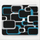 A fun retro inspired pattern of gray, white and peacock blue squares against a black background on a mouse pad