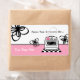 A label featuring an illustration of a retro stove with a pink cooking pot sitting on the front left burner. Stove sits on a black and white floor. Background at bottom is pink. Black flowers surround design. Text at top reads "From The Kitchen Of..." Personalize with your name at bottom. Look for matching items such as apron, recipe binder, recipe letterhead, and recipe cards in the "For Your Kitchen" section of Jill's Paperie.