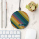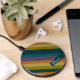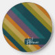A colorful, retro stripe sunrise design with dark, moody colors. Add your name or monogram to make this a personal charger that will stand out amongst your friends. The name is a trendy script in white.
