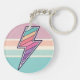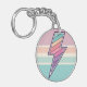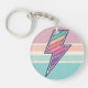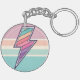 This eye-catching keychain features a bold lightning bolt filled with a groovy, retro-style sunset stripe pattern. The design combines a powerful symbol with a soft, vintage color palette, all set within a circular frame with a subtle speckled texture.