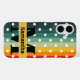 Retro style phone case featuring a pattern of white polka dots on a colorful background of retro color palette stripes. Towards the bottom of the case are two templates. One to add your initial in black lettering and the other to add your name, also in black lettering inside a yellow stripe across the initial.