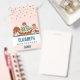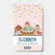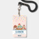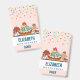 Name badge with a row of delicious looking cupcakes with swirls and cherries and yummy frosting. Illustrated in a classic retro style. Colors include retro green, red, blue and cream. Colorful confetti image sprinkled across the top.