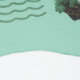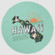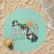 Unique round beach towel features Hawaiian state silhouette with minimalist waves, sun and hula dancers.