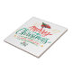 This unique decorative ceramic tile features stylized typography that says "Merry Christmas and Happy New Year" in red and teal green. Above the text is a small retro red truck image with a freshly cut Holiday tree in it. Gold swirls and stars add interest, and a sprig of holly with red berries is at the bottom. Classic and stylish for the Holiday Season.