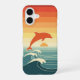 Minimalist dolphin leaping over waves in a soothing vintage style.