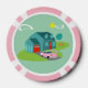 This Retro Suburban House Poker Chip pattern features a typical American home in a typical American neighborhood, circa 1950. A teal home with a peacock blue roof, and turquoise windows are perfectly offset by a vibrant red front door and garage door. A classic pink, 1950’s finned convertible car is parked on the picturesque driveway. Kitschy, plastic, pink flamingos look right at home on the boomerang shape of freshly mowed green grass resting on a jade background. The manicured lawn is landscaped with whimsical trees. Kidney bean shaped clouds and a yellow sunburst of a sun let you know it’s just another glorious day in mid century modern suburbia.