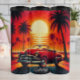 This stylized illustration features a classic red convertible parked on a road at sunset. The large, vibrant sun is setting over the ocean, with its light reflecting on the water. Palm trees are silhouetted against the warm, orange-red sky, creating a nostalgic and retro scene reminiscent of a vintage travel poster.