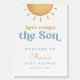 This "Here comes the son" baby shower welcome sign combines boho charm with a retro flair, making it an ideal choice for your sunshine-themed baby shower with yellow and blue tones. Celebrate in retro style and make your special day memorable.