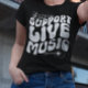 This cool design features the words "Support Live Music" in groovy retro typography.