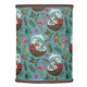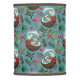 Multicolored retro surf tropical themed graphics on a teal background, seamless repeat pattern
