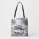 Color your own retro surf adventure with this fun design! A vintage van sits on the sand, surfboards stacked high, waiting for the next ride. The background features rolling waves, palm trees, and a bold sunset. Across the scene, large outlined "SURFING BAG" text in bold Rampart font lets you personalize your tote with fabric color pencils!