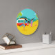 Every day can be a day at the beach with this Retro Surfer Couple Acrylic Wall Clock. The 1960's style, minimalist art design features a fun-loving, sun worshiping, thrill seeking couple all ready to catch a wave. The setting is a tropical, island oasis with a beach of golden sand, swaying, green palm trees, a sparkling, peacock blue ocean, and an aqua sky. In the distance, we can see a teal volcanic island, which is dormant for the time being. Back on the beach, we can't help noticing the sweet ride that brought our couple to their dream destination. It's a mid century modern, red and white van with an orange and yellow surfboard strapped to the top. Though we can't be sure, it's fair to assume that the inside of the van features groovy, shag carpeting and the smell of incense! Surfer Dude and Beach Babe have matching sun-kissed tans, sun-bleached hair, and blue, tiki patterned swimsuits. Surfer Dude is holding a blue surfboard. Beach Babe is standing beside her two-toned, pink surfboard. Lying nearby, there is a red and white beach ball, waiting to fulfill its summer destiny. Catch some waves and share some love with this kitschy summer design!