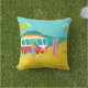 Every day can be a day at the beach with this Retro Surfer Couple Outdoor Pillow. The 1960's style, minimalist art design features a fun-loving, sun worshiping, thrill seeking couple all ready to catch a wave. The setting is a tropical, island oasis with a beach of golden sand, swaying, green palm trees, a sparkling, peacock blue ocean, and an aqua sky. In the distance, we can see a teal volcanic island, which is dormant for the time being. Back on the beach, we can't help noticing the sweet ride that brought our couple to their dream destination. It's a mid century modern, red and white van with an orange and yellow surfboard strapped to the top. Though we can't be sure, it's fair to assume that the inside of the van features groovy, shag carpeting and the smell of incense! Surfer Dude and Beach Babe have matching sun-kissed tans, sun-bleached hair, and blue, tiki patterned swimsuits. Surfer Dude is holding a blue surfboard. Beach Babe is standing beside her two-toned, pink surfboard. Lying nearby, there is a red and white beach ball, waiting to fulfill its summer destiny. The opposite side of this decorative pillow is solid aqua and can be personalized. Catch some waves and share some love with this kitschy summer design!